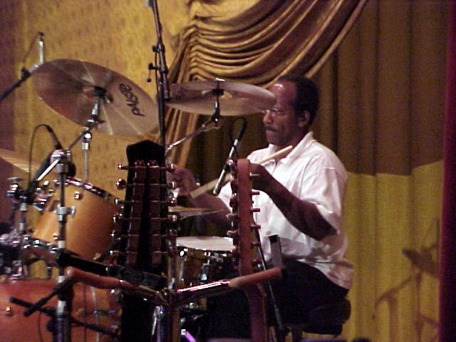 David Mullins and Alyssa Loukota had a booth setup for The Legacy of a Kid Brother of St Frank, and also had some newly printed flyers for the Arts and Music Festival coming up this August here in Wichita - bound to be a marvelous experience. As he had been doing in recent concerts they attended, David played hammered dulcimer on a couple songs. You can tell by the pictures below, I was usually on the left side, and I totally missed David playing, because I couldn't see him behind the speakers. Special thanks to my friend Betty Horn who got the pics of David sitting in. | ||